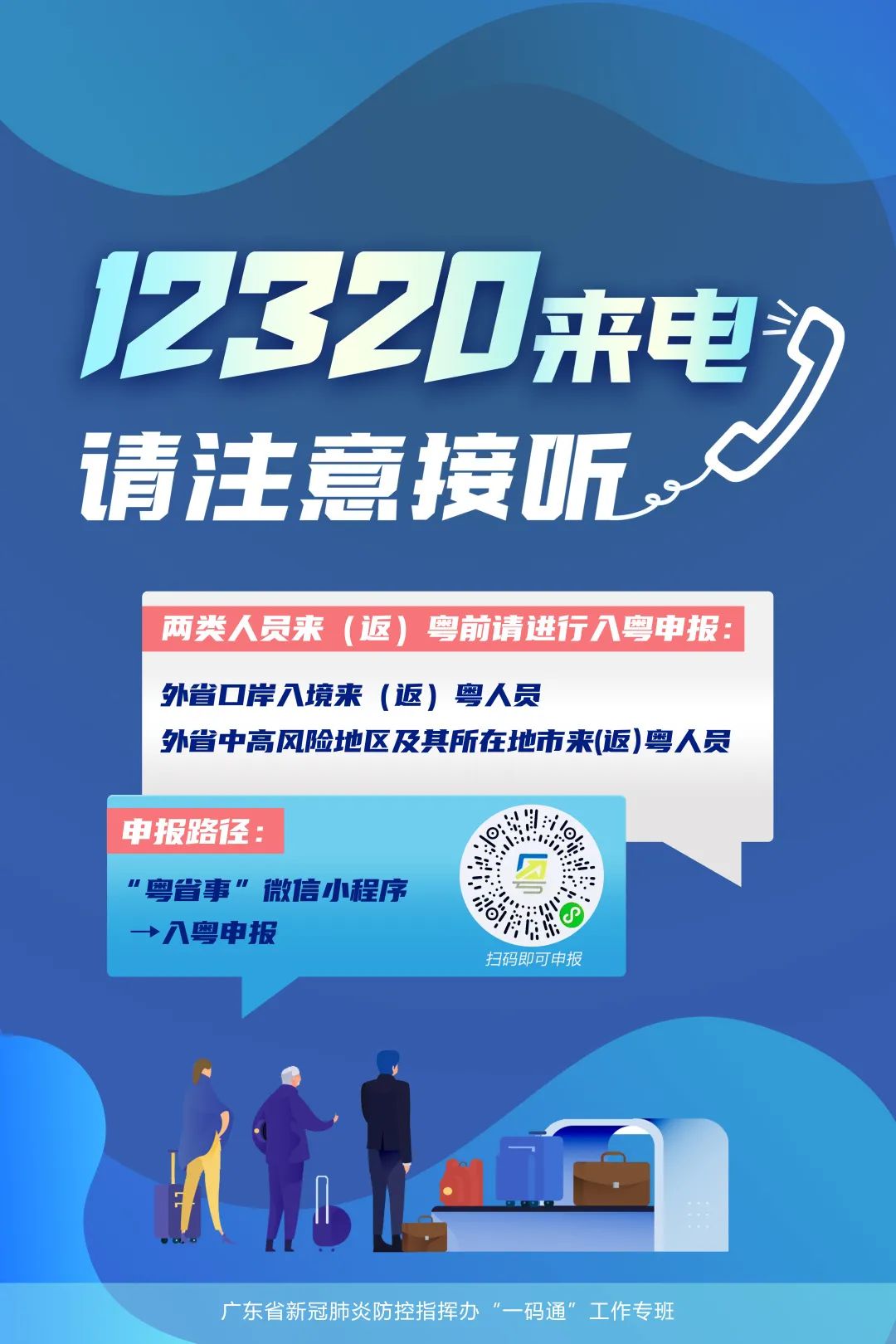 2021年12月28日,广东省正式启用涉疫风险人员排查12320专号。即日起涉疫风险人员来(返)粤前,可在“粤省事”小程序完成入粤申报,并留意接听、查看12320专号电话及短信。 目前,涉疫风险人员主要是指外省口岸入境来(返)粤人员、外省中高风险地区及其所在地市来(返)粤人员。 对涉疫风险人员及时开展排查是做好疫情防控工作的重要举措。自疫情发生以来,广东基层工作人员通过办公电话、个人手机对涉疫风险人员开展排查,因陌生号码导致群众拒接或不相信、不配合的情形高发,不利于排查工作正常开展。 为解决这一问题,广东依托全国公共卫生公益热线12320作为涉疫风险人员排查专号,开通外呼、自动语音播放、短信发送、电话回拨等功能。 这意味着,以后基层工作人员与涉疫风险人员之间的联系将更加畅通,群众可以放心接听12320的来电,也可以通过回拨12320联系到基层工作人员。 12320专号会通过智能语音、短信,引导涉疫风险人员做好入粤申报、提醒留意接听12320专号电话、宣传疫情防控政策和知识、告知入粤注意事项和个人防护措施等。 目的地基层工作人员将通过12320专号联系涉疫风险人员,核实入粤申报信息,根据排查风险等级相应采取集中隔离、居家隔离、居家健康监测、自我健康监测等健康管理措施。 为及时对涉疫风险人员开展健康服务,涉疫风险人员来(返)粤前,应主动通过“粤省事”小程序完成入粤申报(具体申报路径:“粤省事-入粤申报”),如实填报个人基本信息、入粤时间、航班或车次、目的地、健康状况、中高风险地区旅居史等。 对于老人、儿童等不方便使用手机的群体,可由家庭成员、社区工作者代为申报。 广东12320专号常见疑问解答 1、广东12320专号是什么? 12320是全国公共卫生公益热线,为做好涉疫风险人员排查、落实健康管理措施,广东依托12320热线作为涉疫风险人员排查专号,用于引导涉疫风险人员入粤申报,畅通基层工作人员、涉疫风险人员之间的联系,宣传疫情防控政策、普及疫情防控知识等。 2、涉疫风险人员具体指哪些人? 目前涉疫风险人员主要指: 1、外省口岸入境来(返)粤人员; 2、外省中高风险地区及其所在地市来(返)粤人员。 3、 涉疫风险人员来(返)粤前需要做什么? 涉疫风险人员来(返)粤前,应主动通过“粤省事”小程序完成入粤申报。如果是老人、小孩,可由其亲属、监护人或基层工作人员代为申报。 具体申报路径:“粤省事-入粤申报”。申报路径:粤省事小程序 4、入粤申报需要填写哪些内容? 个人基本信息、入粤时间、航班或车次、目的地、健康状况、中高风险地区旅居史等。 5、入粤申报完成后,还需要做什么? 您申报完成后,12320专号会通过智能语音、短信,提醒留意接听12320专号电话,宣传疫情防控政策和知识、告知入粤注意事项和个人防护措施等。 目的地基层工作人员将通过12320专号联系您,核实个人申报信息,请留意接听。 6、涉疫风险人员来(返)粤后,需遵守哪些健康管理措施? 涉疫风险人员来(返)粤后,目的地基层工作人员会通过12320专号与您联系,根据排查风险等级相应采取隔离医学观察、居家健康监测、自我健康监测等健康管理措施。 7、不小心漏接12320电话,或者被手机自动屏蔽,怎么办? 如果您漏接了12320电话,请在48小时内回拨12320专号,可联系到拨打您电话的基层工作人员。 如超过48小时回拨12320专号,广州市民会接入广州市12320卫生热线,可咨询健康知识、卫生政策、预防接种、新冠疫情等卫生健康信息;广东其他地市拨打12320,将接入当地12345政务服务便民热线。 12320属于卫生公益服务热线,只要您不手动屏蔽,手机系统不会自动屏蔽。 8、在社区健康管理期间,我有问题该如何求助? 目的地基层工作人员通过12320专号与您取得联系后,会主动留下手机号码、微信号等联系方式。 您在社区健康管理期间,如有问题可直接联系目的地基层工作人员。 9、涉疫风险人员未及时进行入粤申报,怎么办? 涉疫风险人员来(返)粤前自主进行入粤申报,12320专号及目的地基层工作人员将第一时间联系到您,为您及时提供健康管理服务、落实健康管理措施,让您的健康更有保障。 如您在来(返)粤前没有来得及申报,要在抵粤后第一时间到所在社区报备有关信息。 10、入粤申报信息会泄露吗? 不会。涉疫风险人员的入粤申报信息将严格保密,仅用于疫情排查工作。 目的地基层工作人员与您联系时,只会核实您个人申报的信息,不会涉及银行卡号、密码等个人财务信息。如被问及个人财务信息等,请保持警惕,及时报警,避免上当受骗。 疫情防控需你我共同努力,让我们积极配合疫情防控措施早日和新冠疫情说再见!