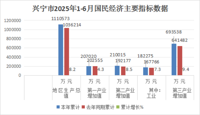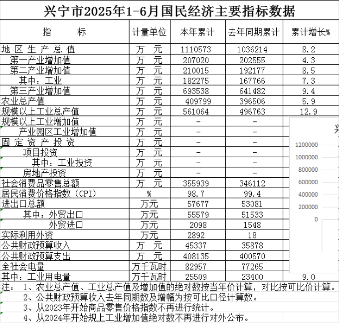 今年以来,兴宁市坚持以习近平新时代中国特色社会主义思想为指导,认真贯彻落实中央、省、市各项决策部署,上半年全市经济运行呈稳中向好态势。 根据梅州市地区生产总值统一核算结果,2025年上半年我市地区生产总值为111.06亿元,同比增长8.2%,增速在梅州排位第二,比一季度(8.1%)提高0.1个百分点,比去年同期(4.4%)提高3.8个百分点,分别比全国(5.3%)、广东省(4.2%)、梅州市(5.7%)高2.9、4.0、2.5个百分点。其中,第一产业增加值20.70亿元,同比增长4.3%;第二产业增加值21.00亿元,同比增长8.5%;第三产业增加值69.35亿元,同比增长9.4%。三次产业结构比为18.64:18.91:62.45。 1.农林牧渔业保持平稳增长。上半年,我市完成农林牧渔业总产值40.98亿元,同比增长5.9%,增速在梅州排位第二。其中,农业产值26.86亿元,同比增长3.9%;林业产值0.57亿元,同比增长83.9%;牧业产值11.14亿元,同比增长2.5%;渔业产值1.01亿元,同比增长4.0%;农林牧渔业辅助性活动产值1.41亿元,同比增长117.3%。 2.规上工业保持良好态势。上半年,我市完成规上工业总产值56.11亿元,同比增长12.9%;规模以上工业增加值同比增长12.4%,增速在梅州排位第三。其中:兴宁园区规上工业增加值同比增长11.9%。 3.社会消费品零售总额保持正增长。上半年,我市实现社会消费品零售总额35.59亿元,同比增长2.8%,增速在梅州排位第三。 4.固定资产投资增速提高。上半年,我市固定资产投资同比增长14.9%,增速比一季度提高14.5个百分点,在梅州排位第一。其中:项目投资同比增长23.4%;工业投资同比增长32.6%;房地产完成投资同比下降7.7%。 5.财政收入保持较快增长。上半年,我市累计实现一般公共财政预算收入4.53亿元,同比增长26.4%,增速在梅州排位第二;完成一般公共财政预算支出40.81亿元,同比增长1.9%。 6、外贸进出口保持正增长。上半年月,我市完成进出口总额5.77亿元,同比增长8.7%,增速在梅州排位第四。其中,出口总额5.56亿元,同比增长7.9%;进口总额0.21亿元,同比增长35.5%。实际利用外资2892万元。 7、居民消费价格总体平稳,居住和交通类降幅较大。上半年,我市居民消费价格指数同比下降1.3%。其中,其他用品及服务类增长3.4%,教育文化娱乐类与去年同期持平,衣着类、医疗保健类、生活用品及服务类、食品烟酒类、交通通信类、居住类分别下降0.1%、0.1%、0.4%、0.8%、2.9%、3.0%。