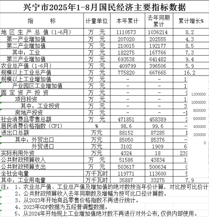 1-8月,我市经济总体运行平稳,各项主要经济指标数据增长有力,规上工业增加值、固定资产投资、社会消费品零售总额、财政收入、贸易进出口总额均取得正增长,具体情况如下: 1.规上工业增势稳定。1-8月,我市规上工业总产值完成77.58亿元,同比增长16.2%;规上工业增加值同比增长13.3%,比1-7月提升1.2个百分点,增速在梅州排位第三。其中:兴宁园区内规上工业增加值同比增长11.8%。 2.固定资产投资保持增长。1-8月,我市固定资产投资同比增长9.8%,比1-7月回落1.1个百分点,增速在梅州排位第二。其中:项目投资同比增长17.9%;工业投资同比增长30%;房地产投资同比下降12.7%。 3.社会消费品零售总额保持增长。1-8月,我市实现社会消费品零售总额47.19亿元,同比增长2.9%,增速比1-7月回落0.1个百分点,在梅州排位第二。 4.财政收入保持较快增长。1-8月,我市累计实现一般公共财政预算收入5.16亿元,同比增长17.7%,增速梅州排位第一;完成一般公共财政预算支出50.36亿元,同比增长0.6%。 5.贸易进出口总额保持增长。1-8月,我市实现贸易进出口总额8.82亿元,同比增长1.0%,增速在梅州排位第四。其中:出口总额8.51亿元,同比下降0.4%;进口总额0.31亿元,同比增长62.5%。实际利用外资4324万元。 6.物价保持稳定。1-8月,全市居民消费价格指数同比下降1.4%。其中,衣着类、生活用品及服务类、其他用品及服务类分别增长0.1%、0.1%、3.9%,教育文化娱乐类、医疗保健类、食品烟酒类、交通通信类、居住类分别下降0.2%、0.2%、1.2%、2.9%、3.2%。
