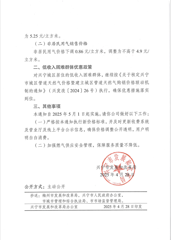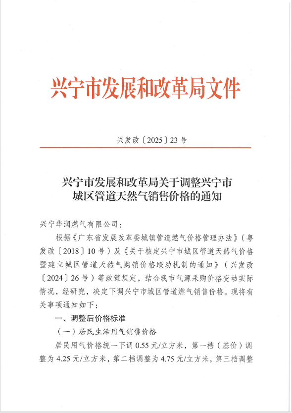 兴宁市发展和改革局关于调整兴宁市城区管道天然气销售价格的通知