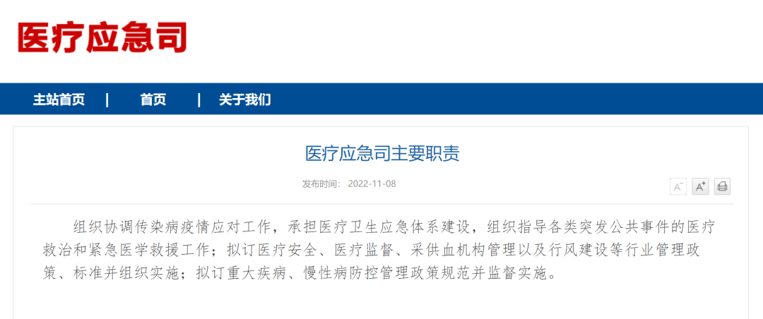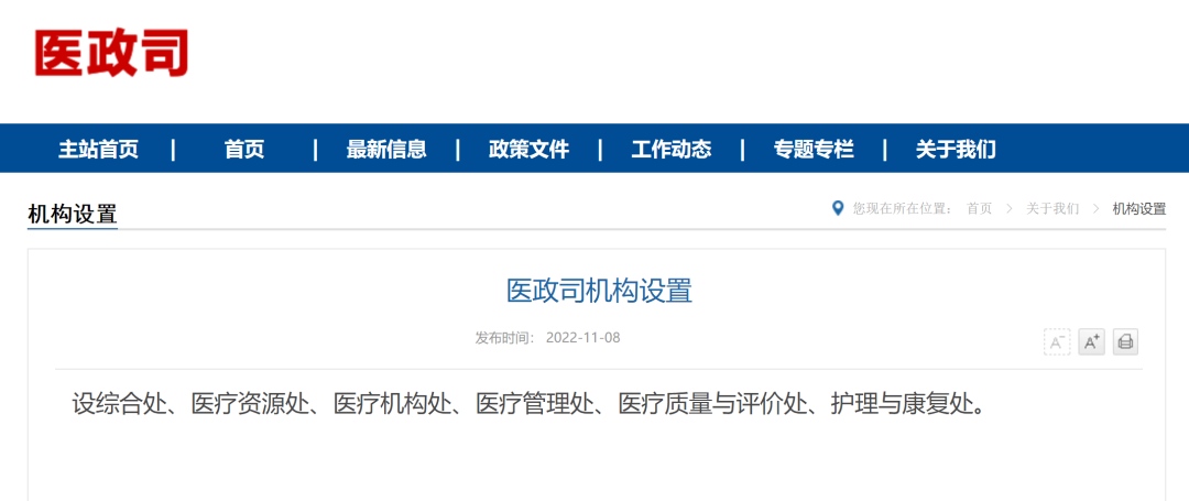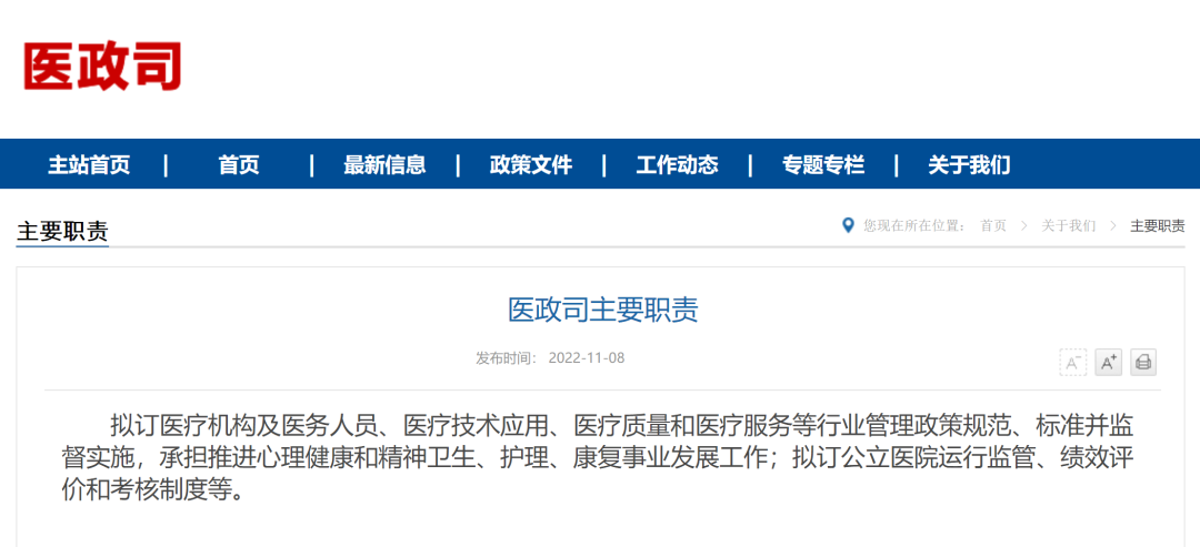 近日,国家卫生健康委员会对内设机构正式做出调整,原医政医管局更名为医政司,原卫生应急办公室更名为医疗应急司,同时撤销疾病预防控制局、综合监督局。 原医政医管局更名为医政司,医政司下设综合处、医疗资源处、医疗机构处、医疗管理处、医疗质量与评价处、护理与康复处。 该司主要职责为拟订医疗机构及医务人员、医疗技术应用、医疗质量和医疗服务等行业管理政策规范、标准并监督实施,承担推进心理健康和精神卫生、护理、康复事业发展工作;拟订公立医院运行监管、绩效评价和考核制度等。 原卫生应急办公室(突发公共卫生事件应急指挥中心)更名为医疗应急司,医疗应急司下设综合处(行风处)、医疗应急管理处、医疗应急指导处、公共卫生医疗管理处、医疗卫生安全和血液管理处、医疗监督处。 该司主要职责为组织协调传染病疫情应对工作,承担医疗卫生应急体系建设,组织指导各类突发公共事件的医疗救治和紧急医学救援工作;拟订医疗安全、医疗监督、采供血机构管理以及行风建设等行业管理政策、标准并组织实施;拟订重大疾病、慢性病防控管理政策规范并监督实施。 同时国家卫健委原机关党委更名为机关党委(党组巡视工作领导小组办公室),负责机关和在京直属单位党的建设和纪检工作,领导机关群团组织的工作,承担内部巡视工作。 机关党委(党组巡视工作领导小组办公室)设立机关纪委,承担机关和在京直属单位纪检、党风廉政建设有关工作。 此外,国家卫健委机构设置中不再设立疾病预防控制局、综合监督局。 2022年2月,中共中央办公厅、国务院办公厅发布《关于调整国家卫生健康委员会职能配置、内设机构和人员编制的通知》,公布了国家卫健委职能配置、内设机构和人员编制调整事项。 调整后,国家卫健委设19个内设机构及机关党委(党组巡视工作领导小组办公室)、离退休干部局。机关行政编制464名。设主任1名,副主任4名,司局级领导职数80名(含机关党委专职副书记1名、机关纪委领导职数1名、卫生健康监察专员10名、离退休干部局领导职数2名)。 来源:国家卫健委官网
