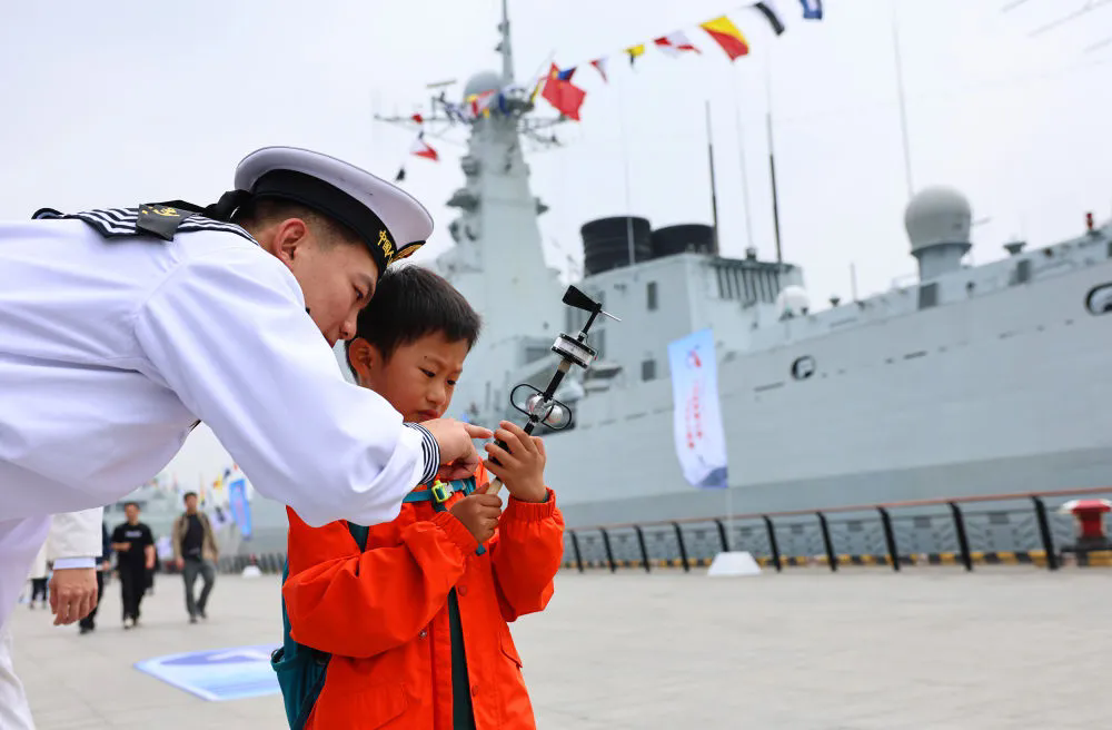 4月22日,一个小朋友在海军战士指导下体验使用三杯风向风速仪。新华社记者 方喆 摄