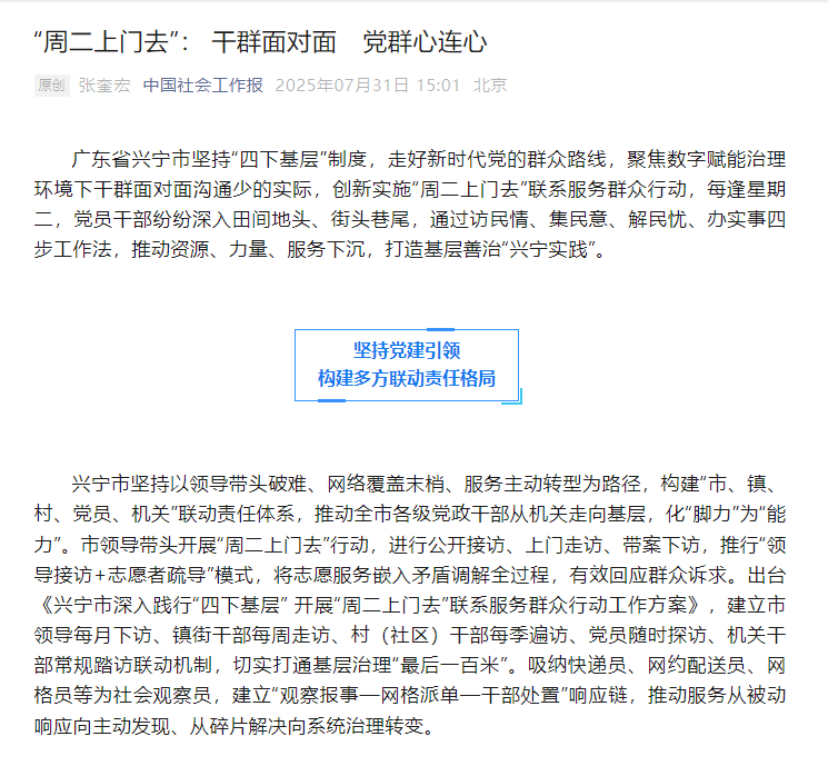 近日,我市创新实施的“周二上门去”联系服务群众行动成功经验,在《中国社会工作报》刊发,引发广泛关注。这篇题为《“周二上门去”:干群面对面党群心连心》的报道,生动展现了我市在践行“四下基层”制度、走好新时代群众路线中的突破性实践。这一行动不仅破解了数字时代干群沟通的难题,更以“访民情、集民意、解民忧、办实事”的四步工作法为核心,推动资源、力量、服务下沉田间地头,构筑起“兴宁实践”的治理标杆。