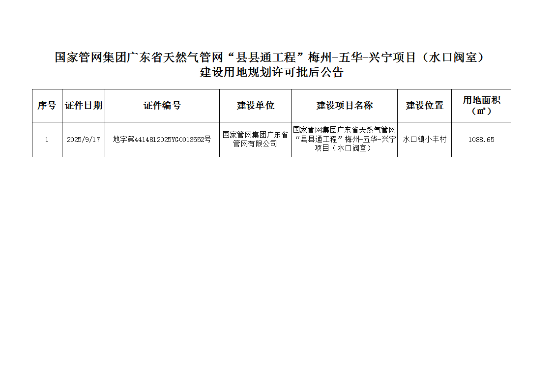 国家管网集团广东省天然气管网“县县通工程”梅州-五华-兴宁项目(水口阀室)建设用地规划许可批后公告