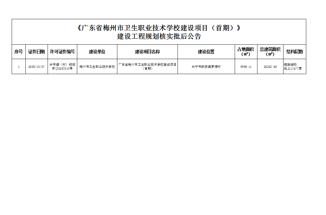 《广东省梅州市卫生职业技术学校建设项目(首期)》建设工程规划核实批后公告