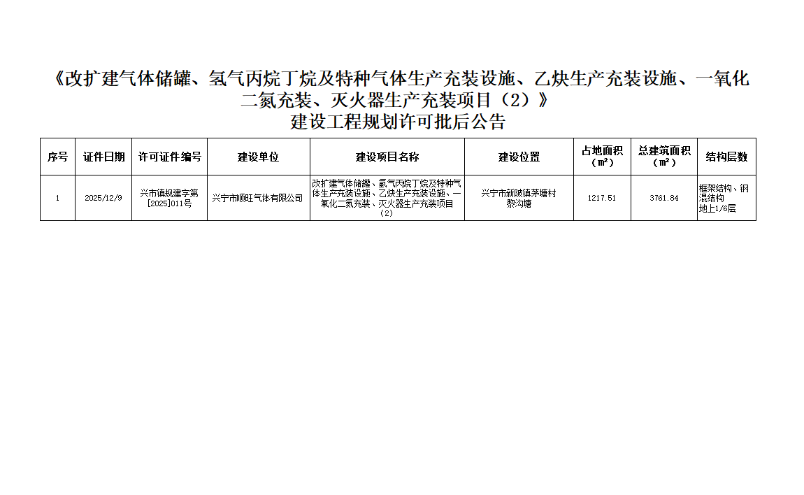 《改扩建气体储罐、氢气丙烷丁烷及特种气体生产充装设施、乙炔生产充装设施、一氧化二氮充装、灭火器生产充装项目(2)》建设工程规划许可批后公告