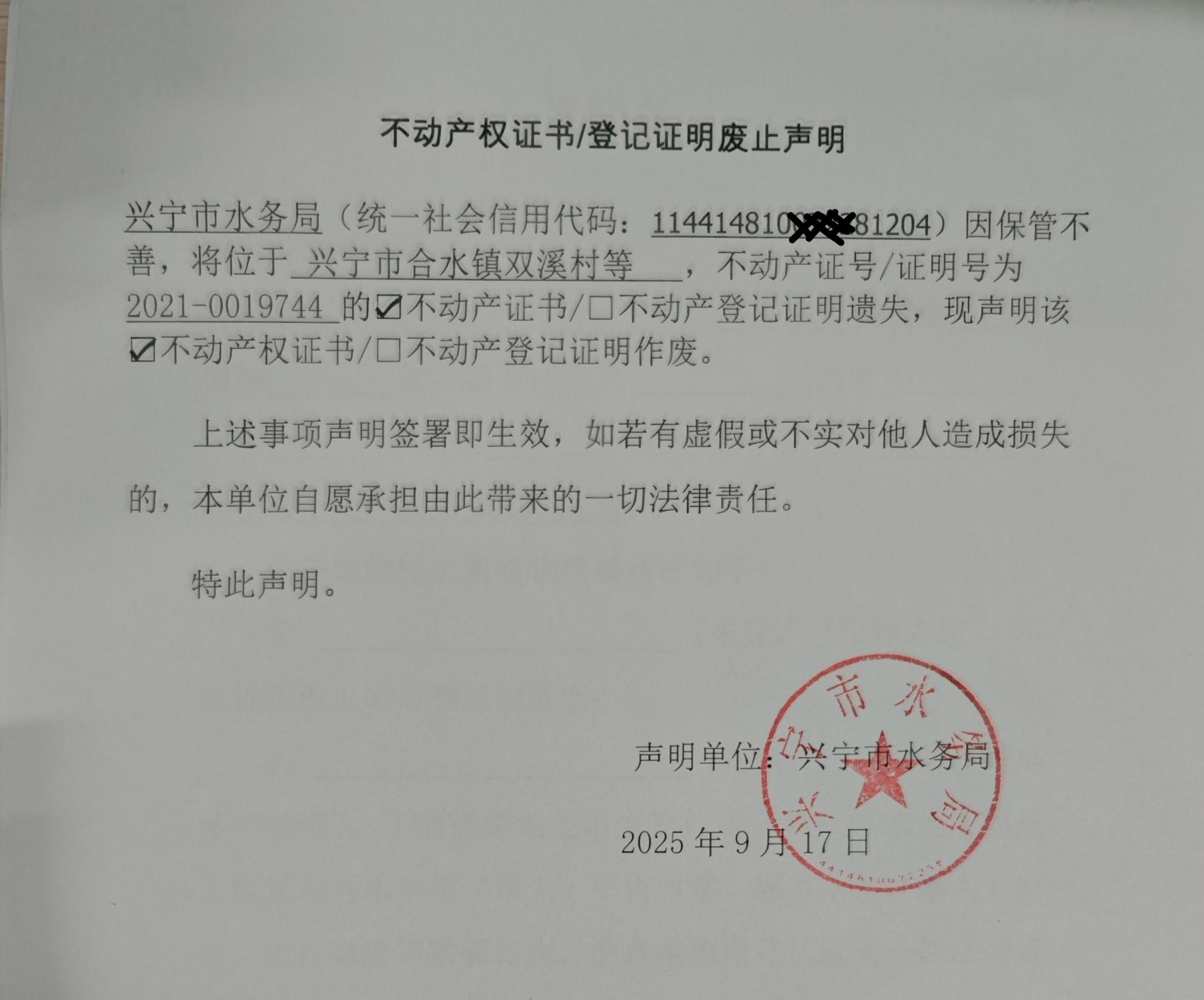 不动产权证书/登记证明废止声明