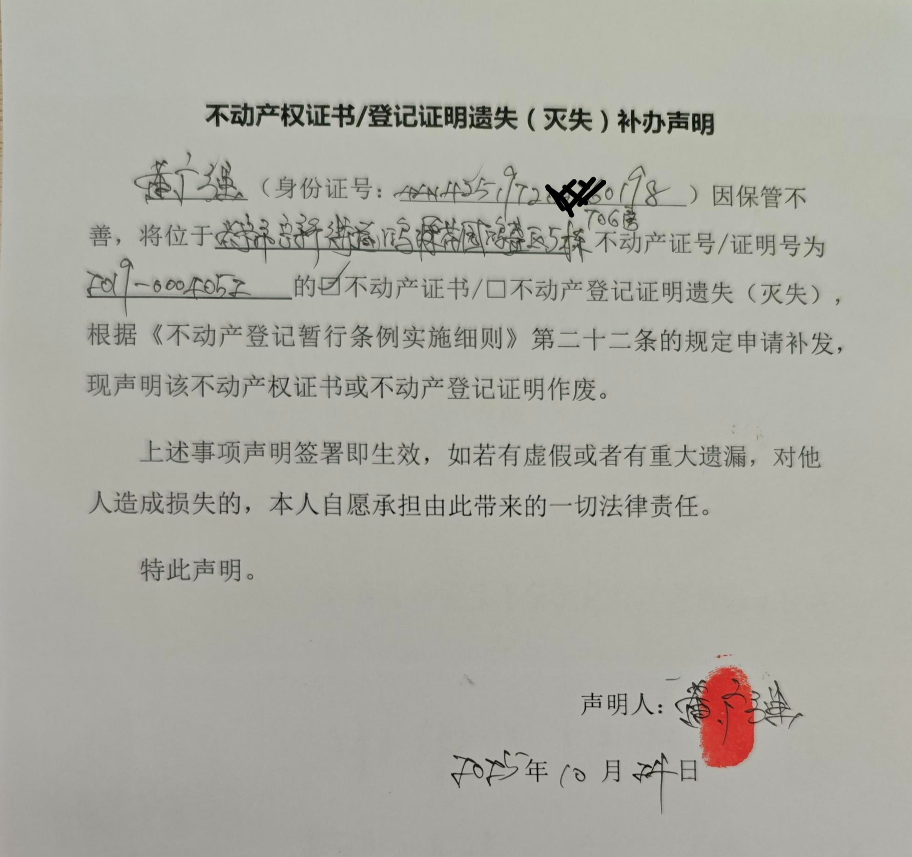 不动产权证书/登记证明遗失(灭失)补办声明