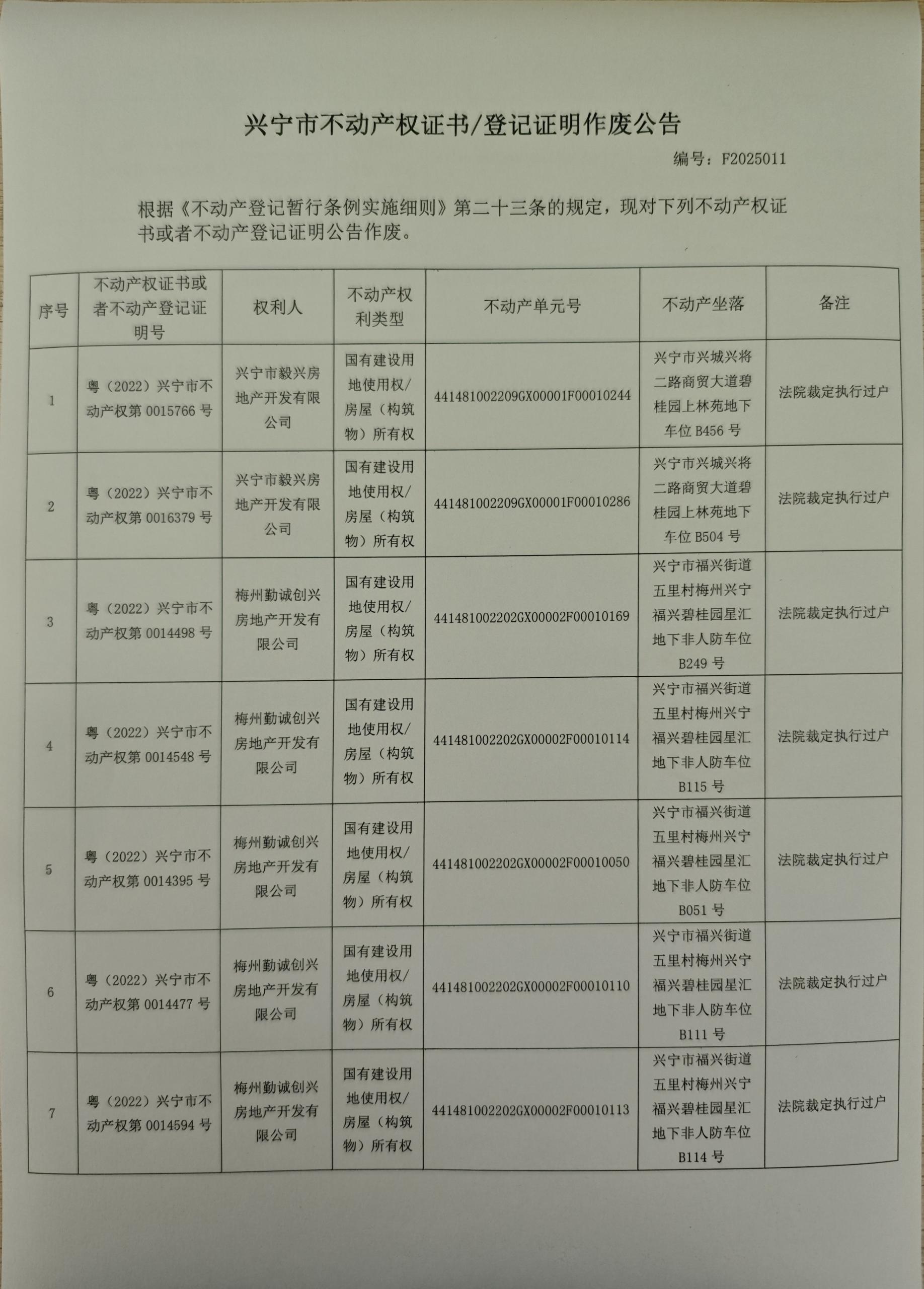 兴宁市不动产权证书/登记证明作废公告