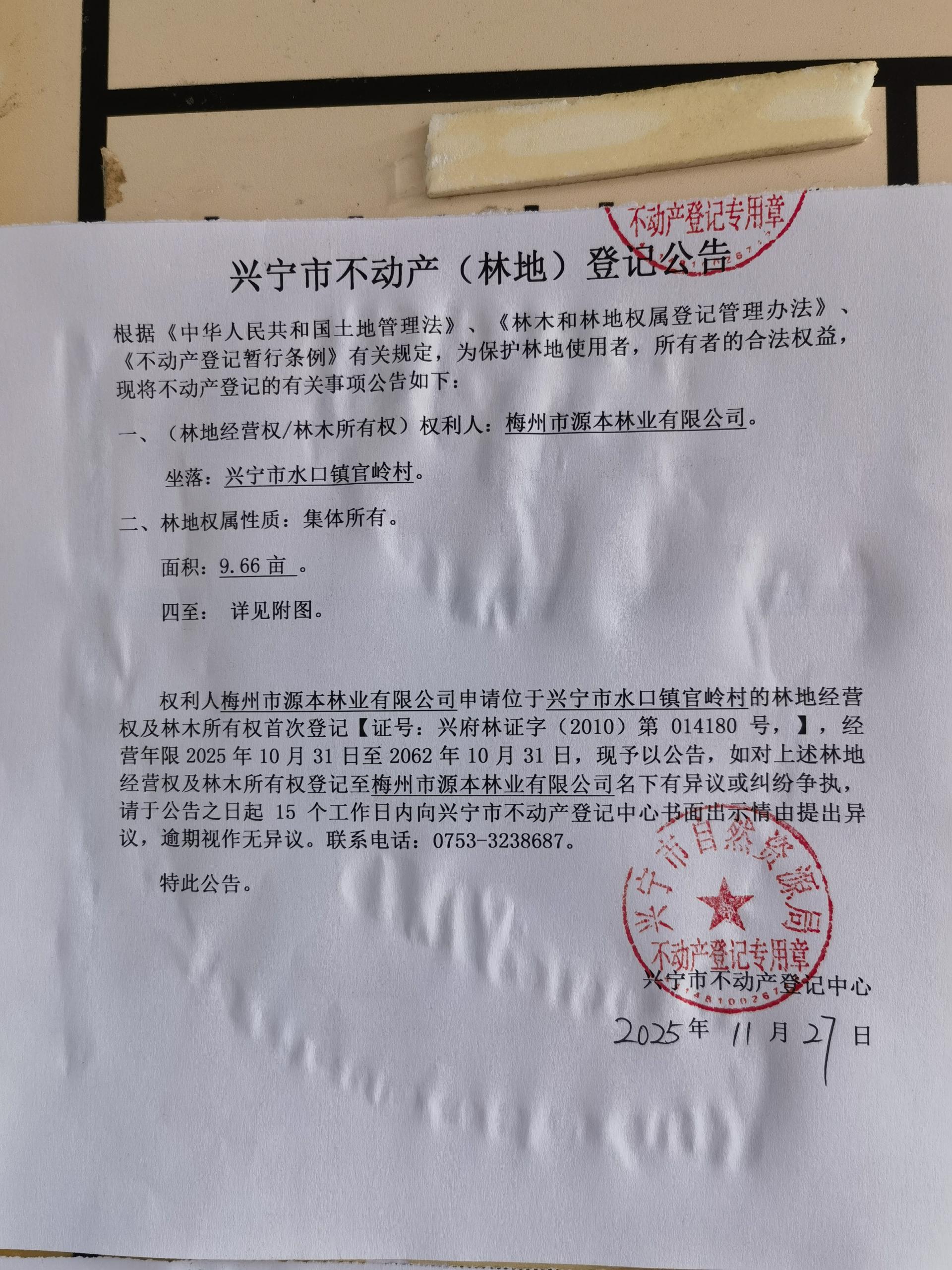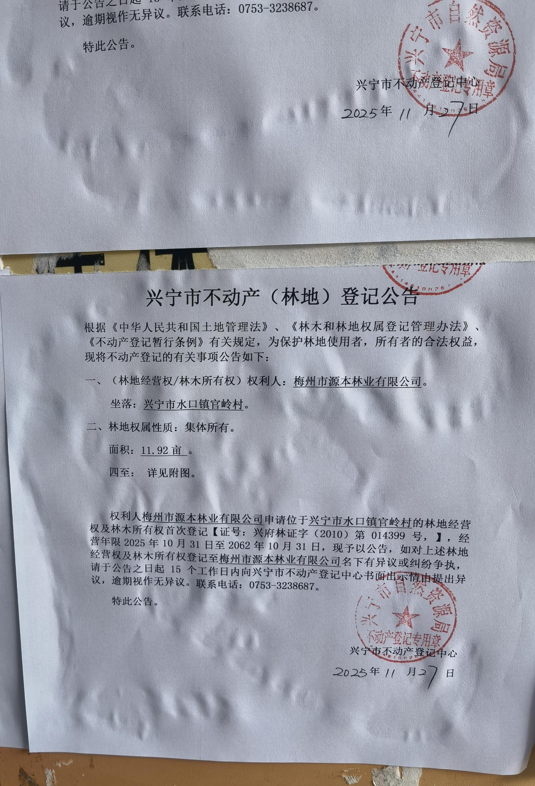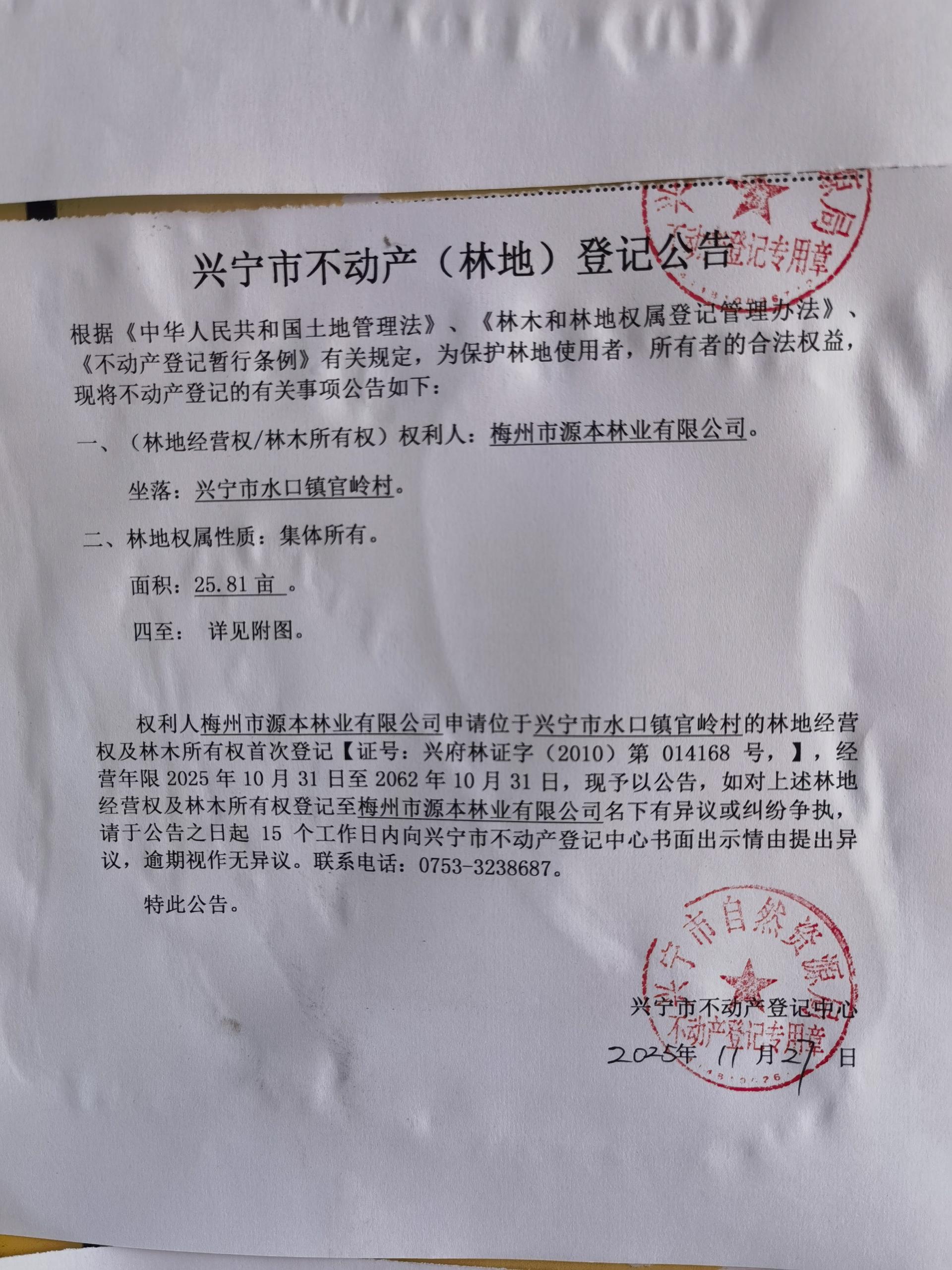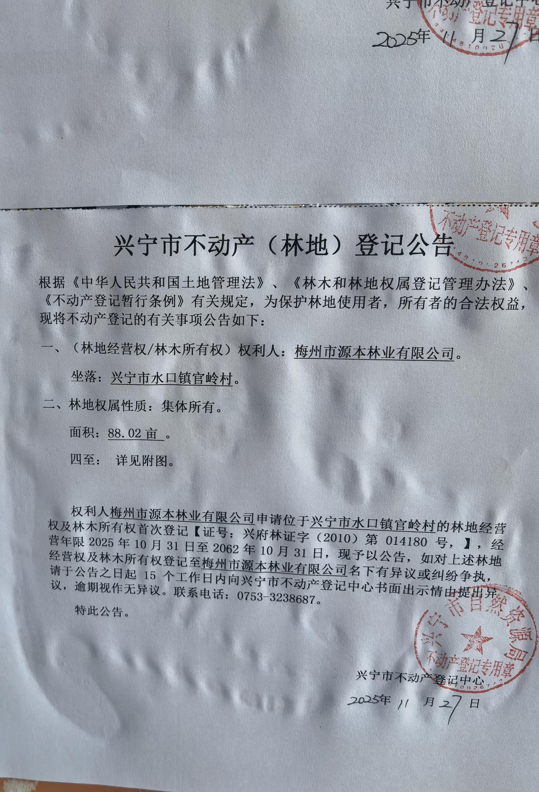 兴宁市不动产登记公告(林地经营权首次登记)——官岭村