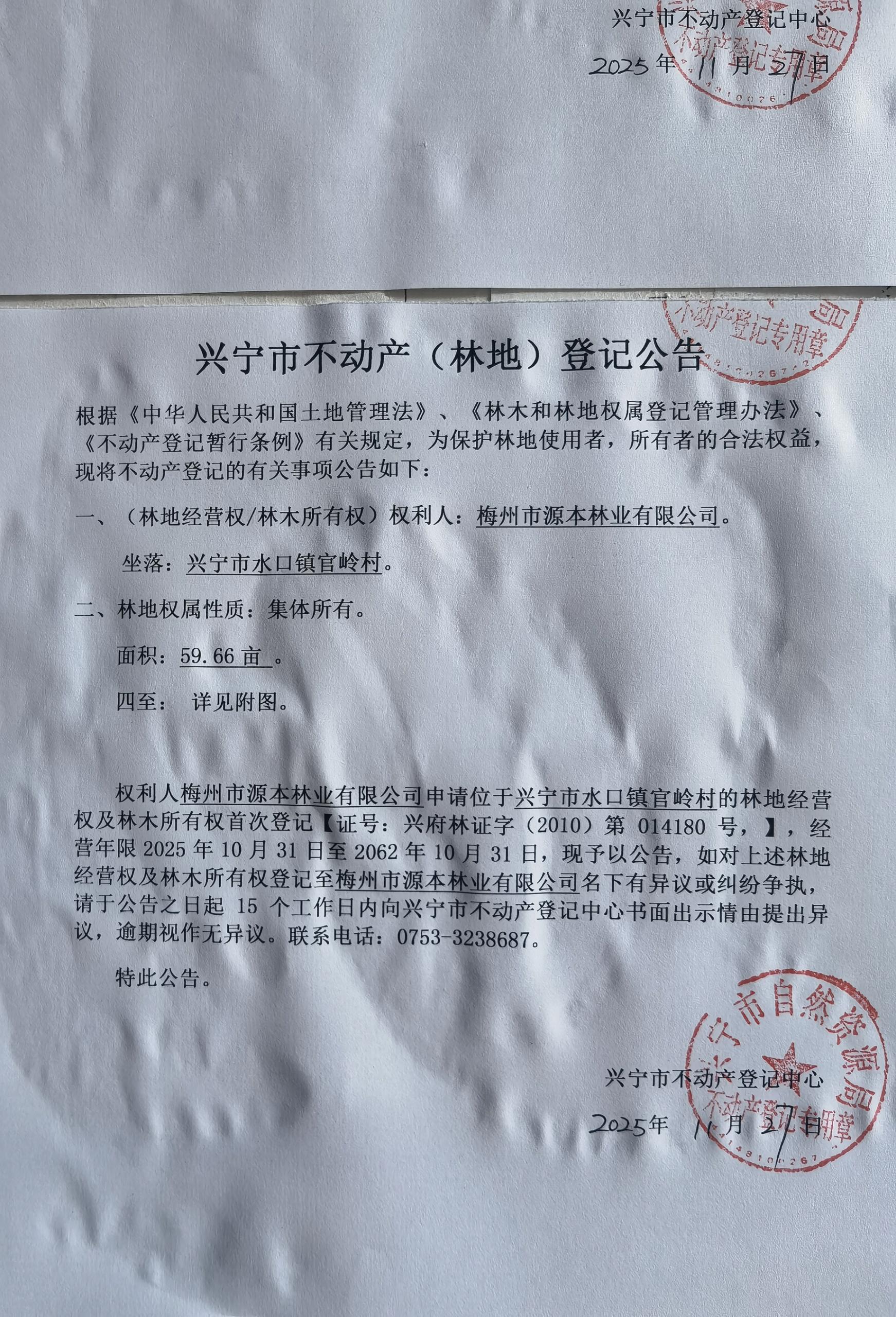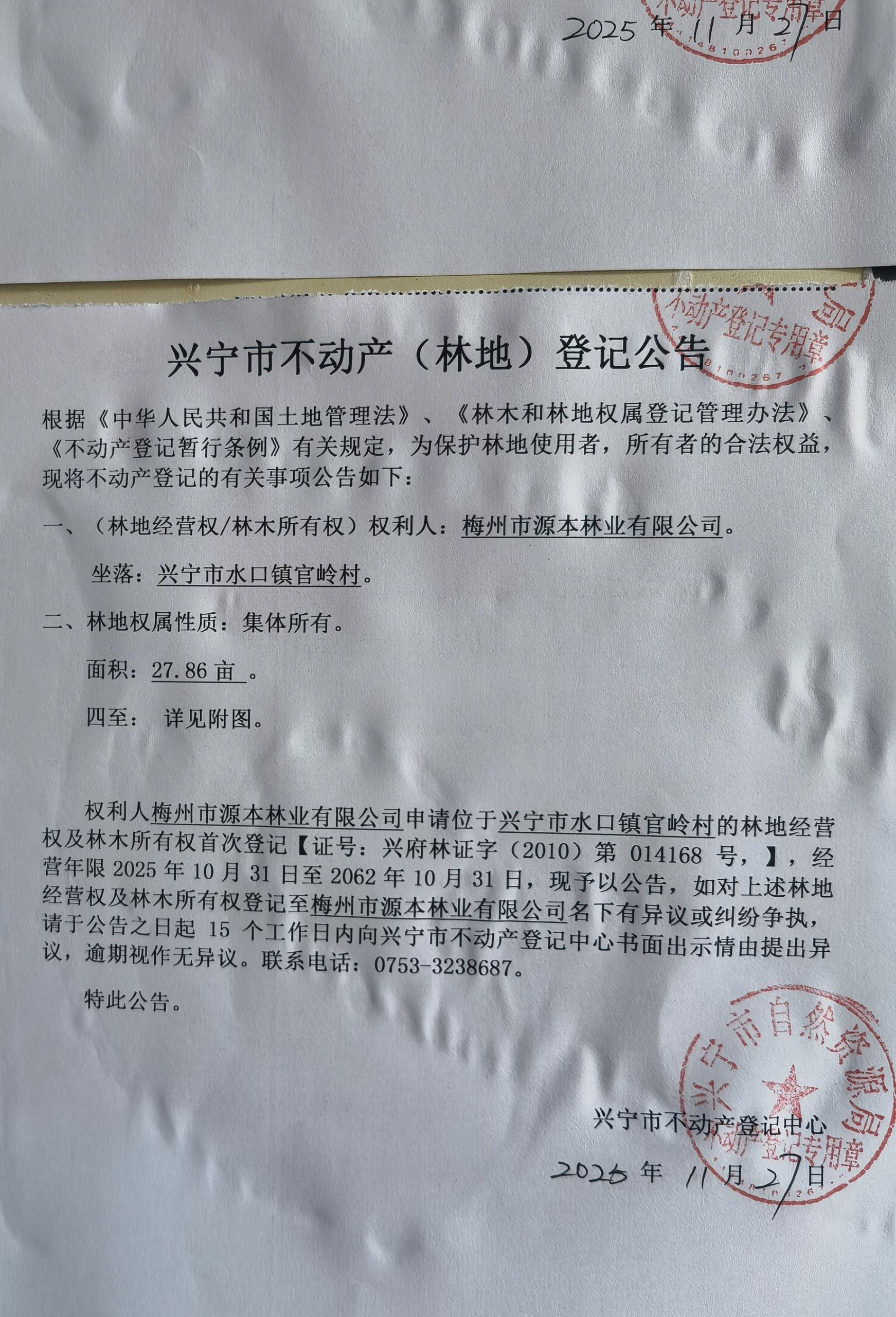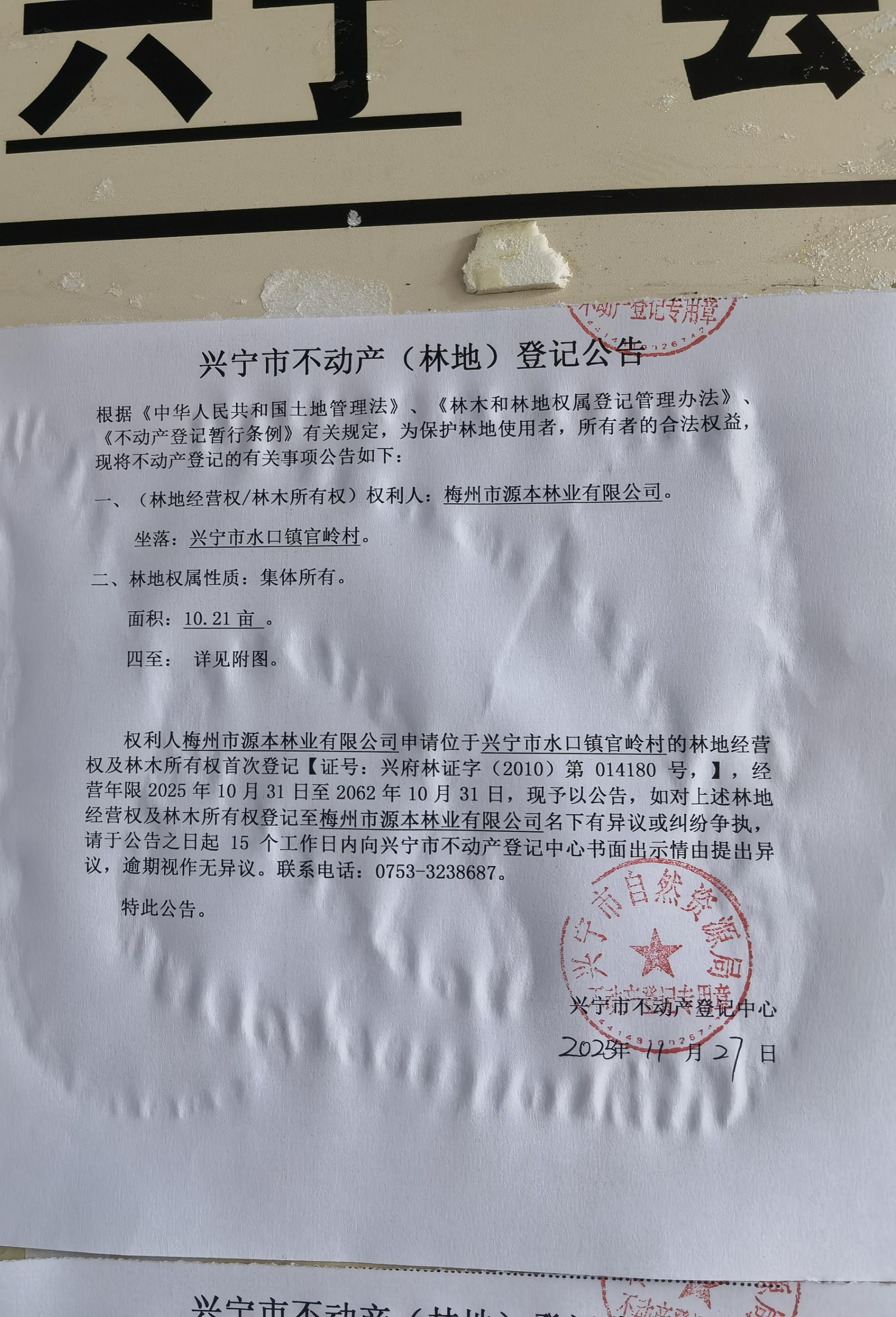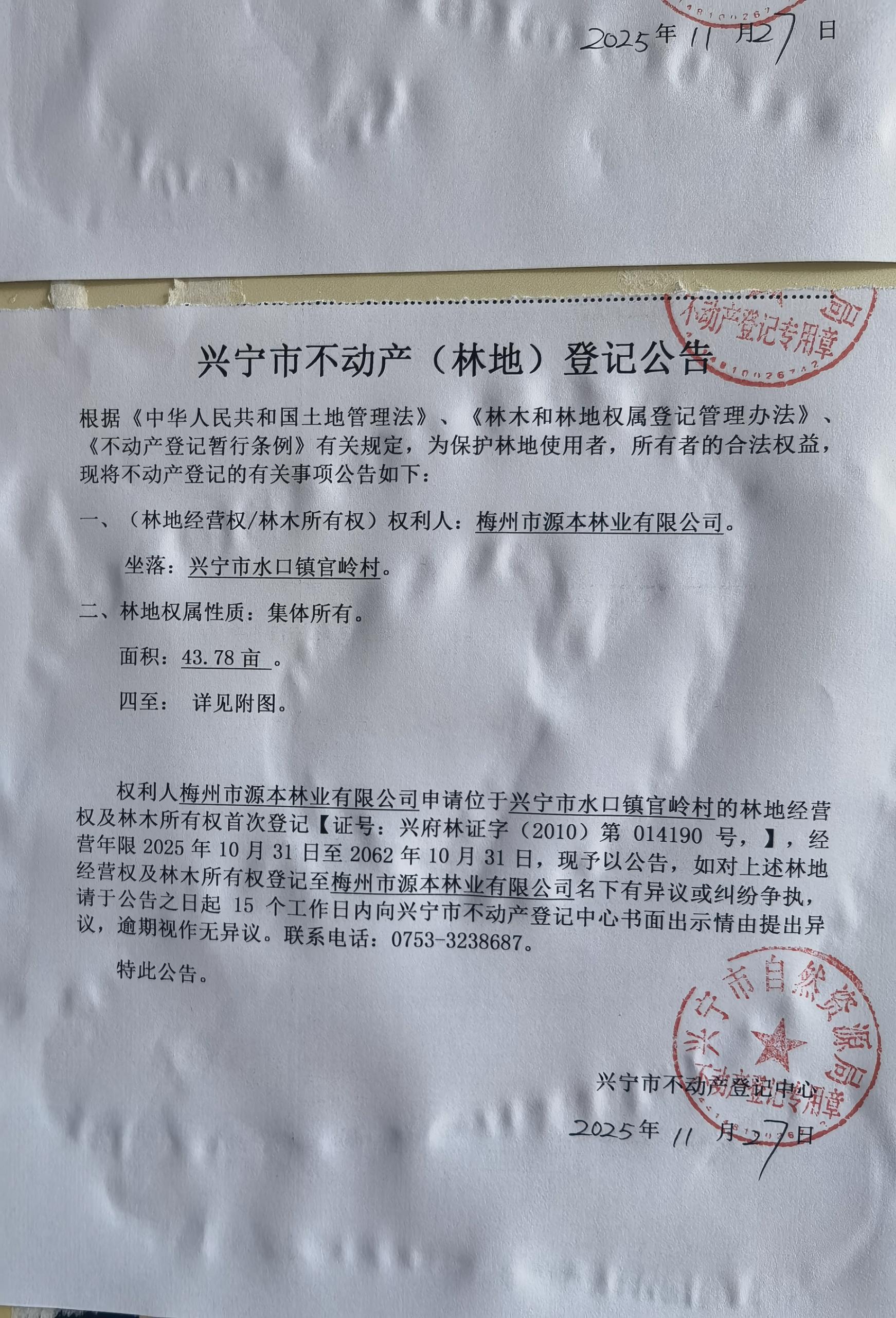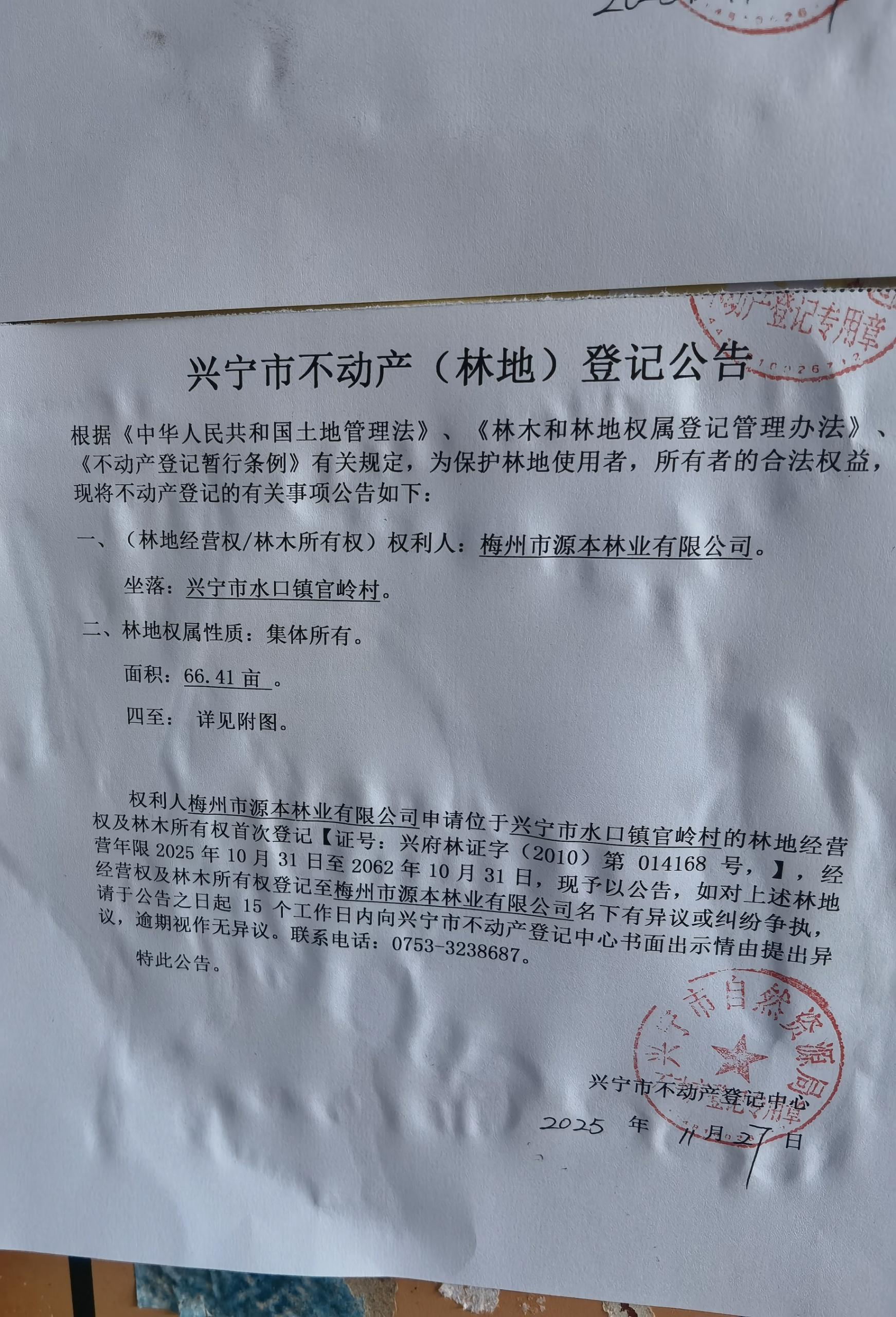 兴宁市不动产登记公告(林地经营权首次登记)——官岭村