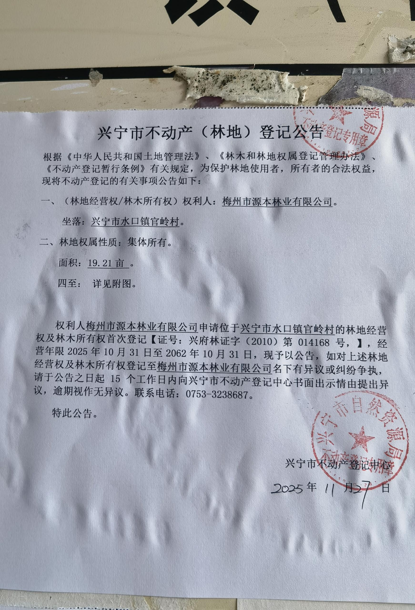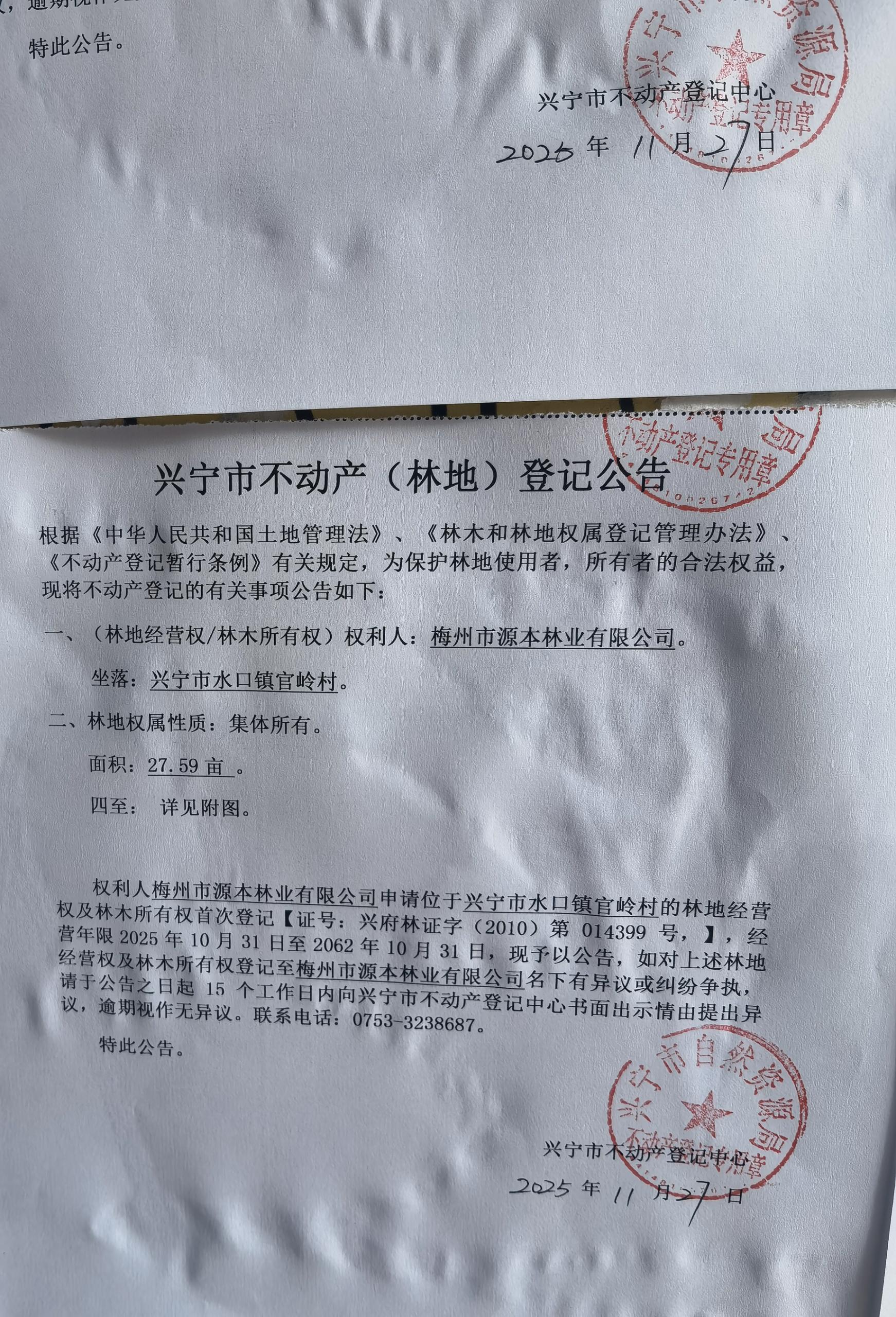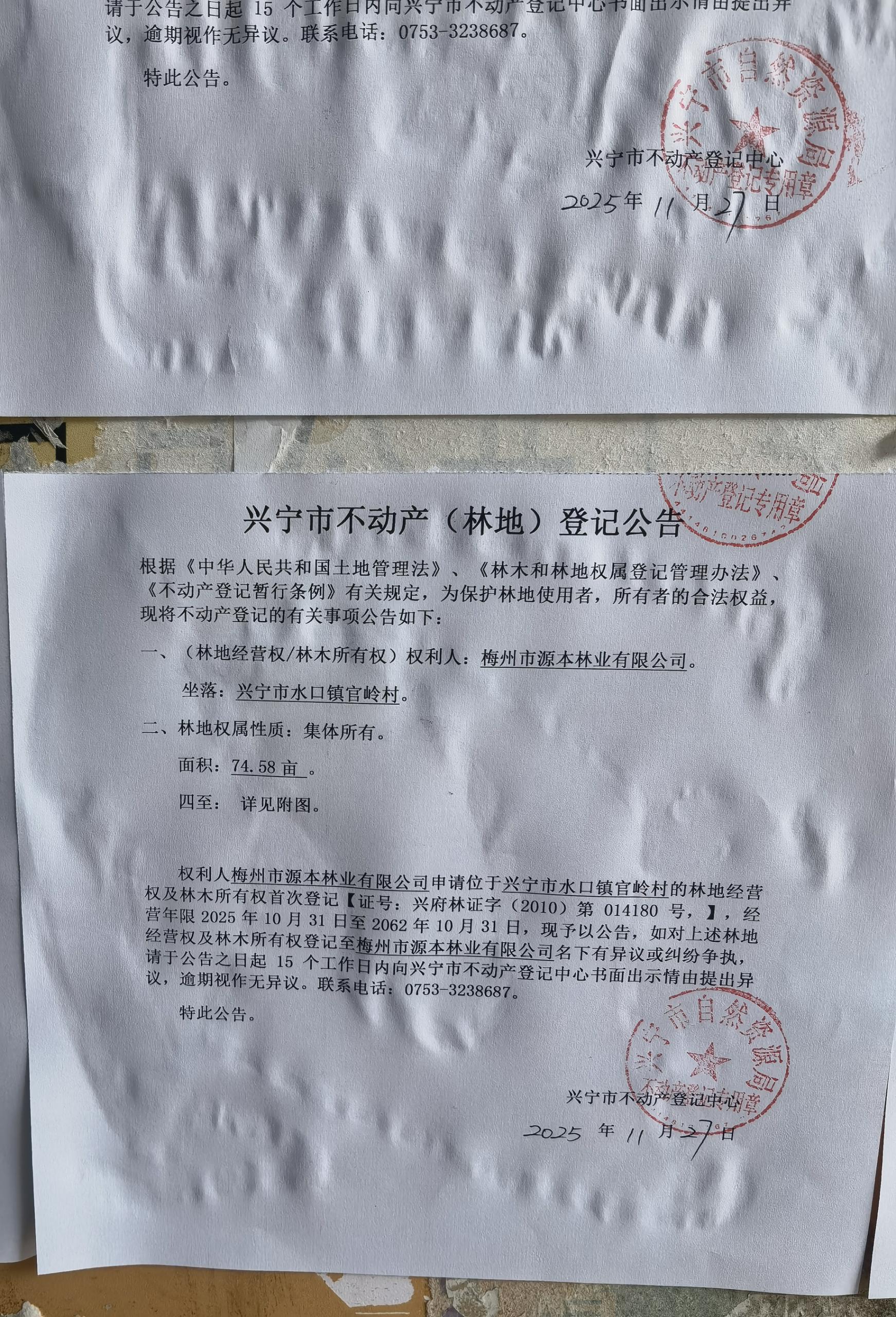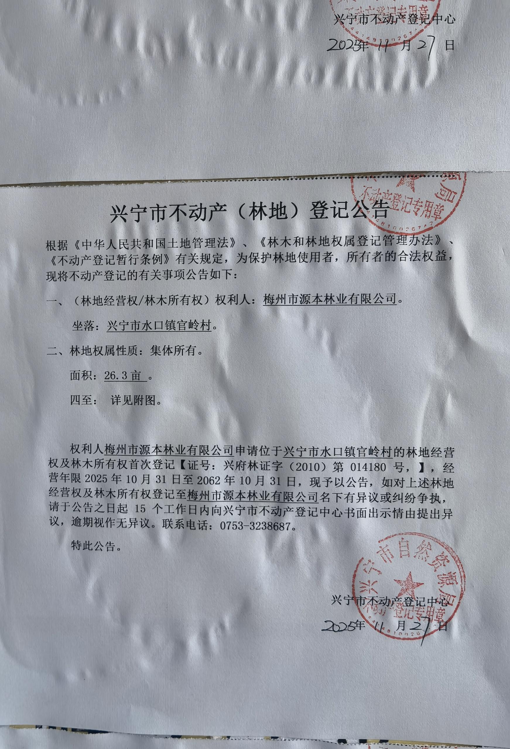 兴宁市不动产登记公告(林地经营权首次登记)——官岭村