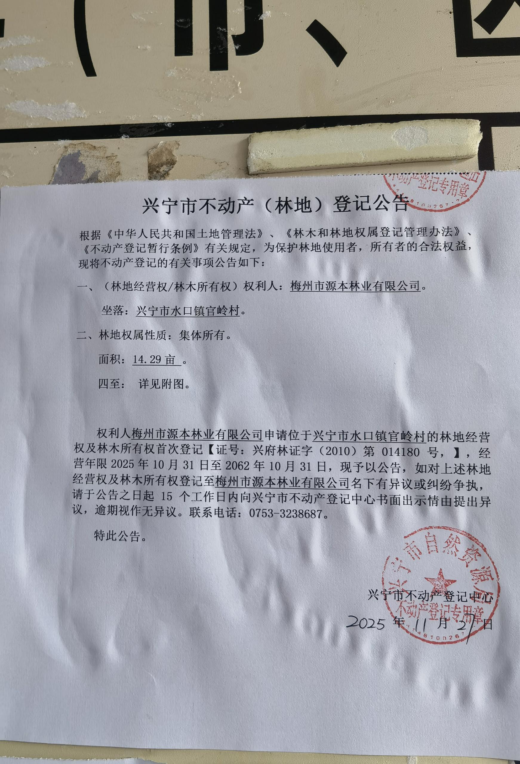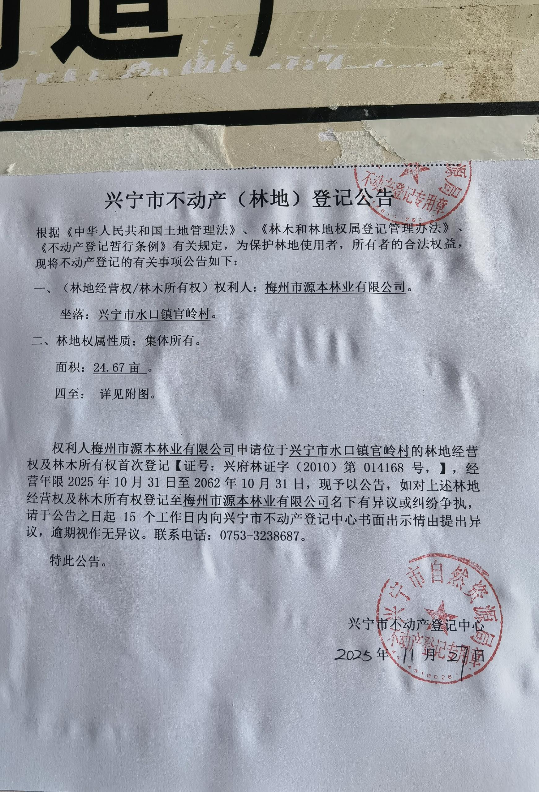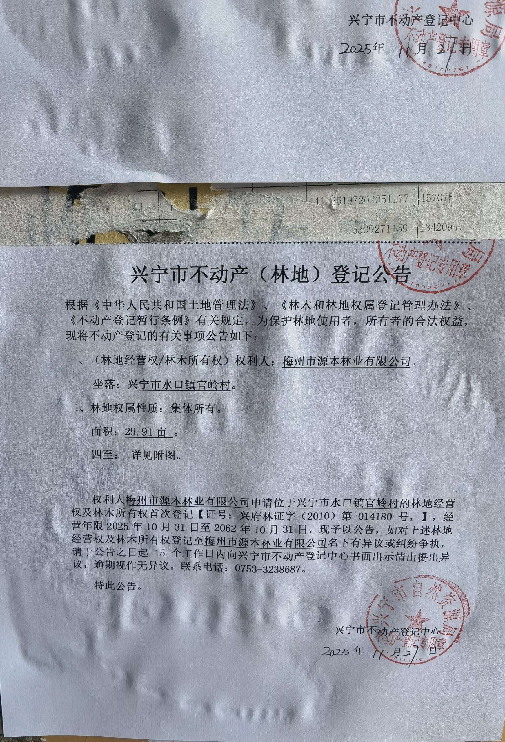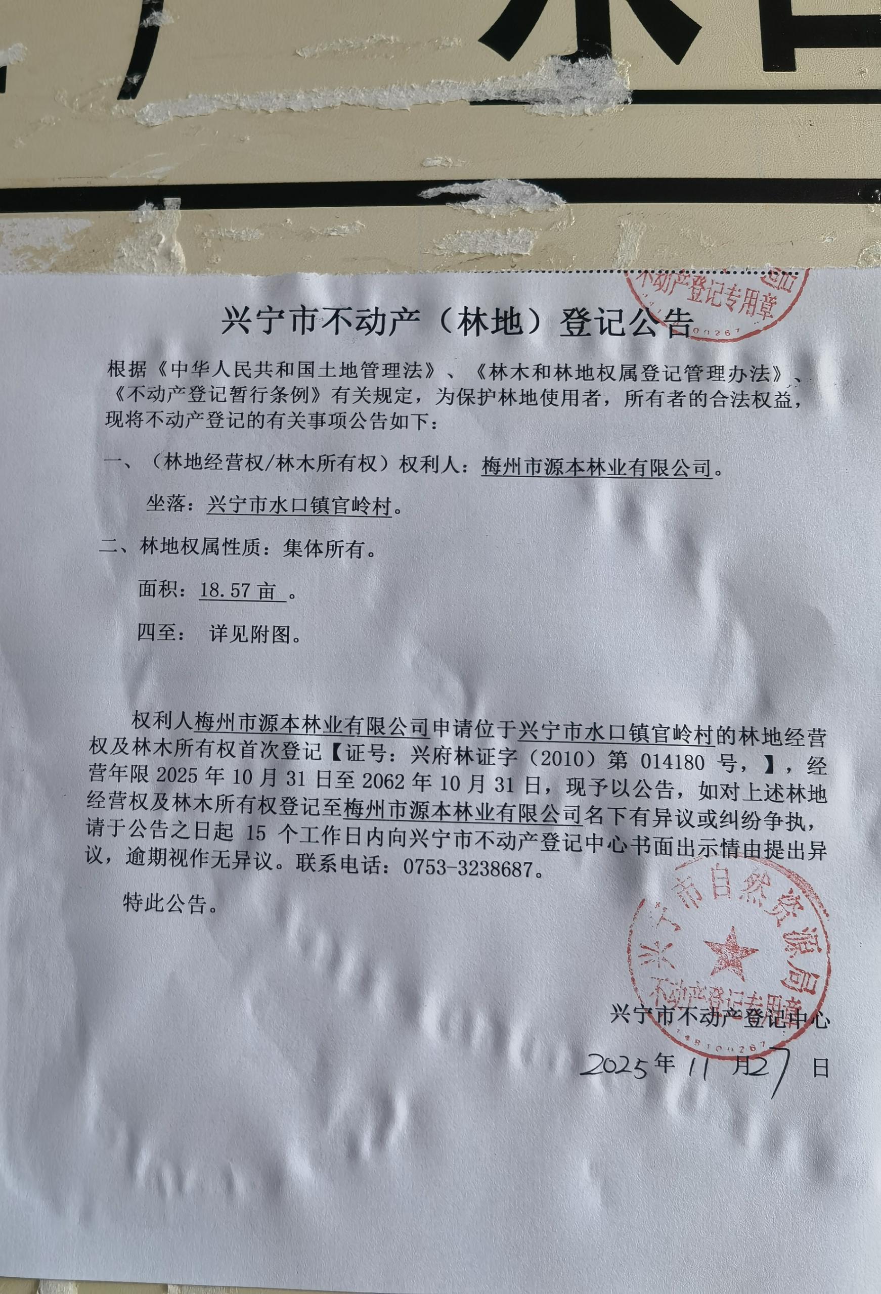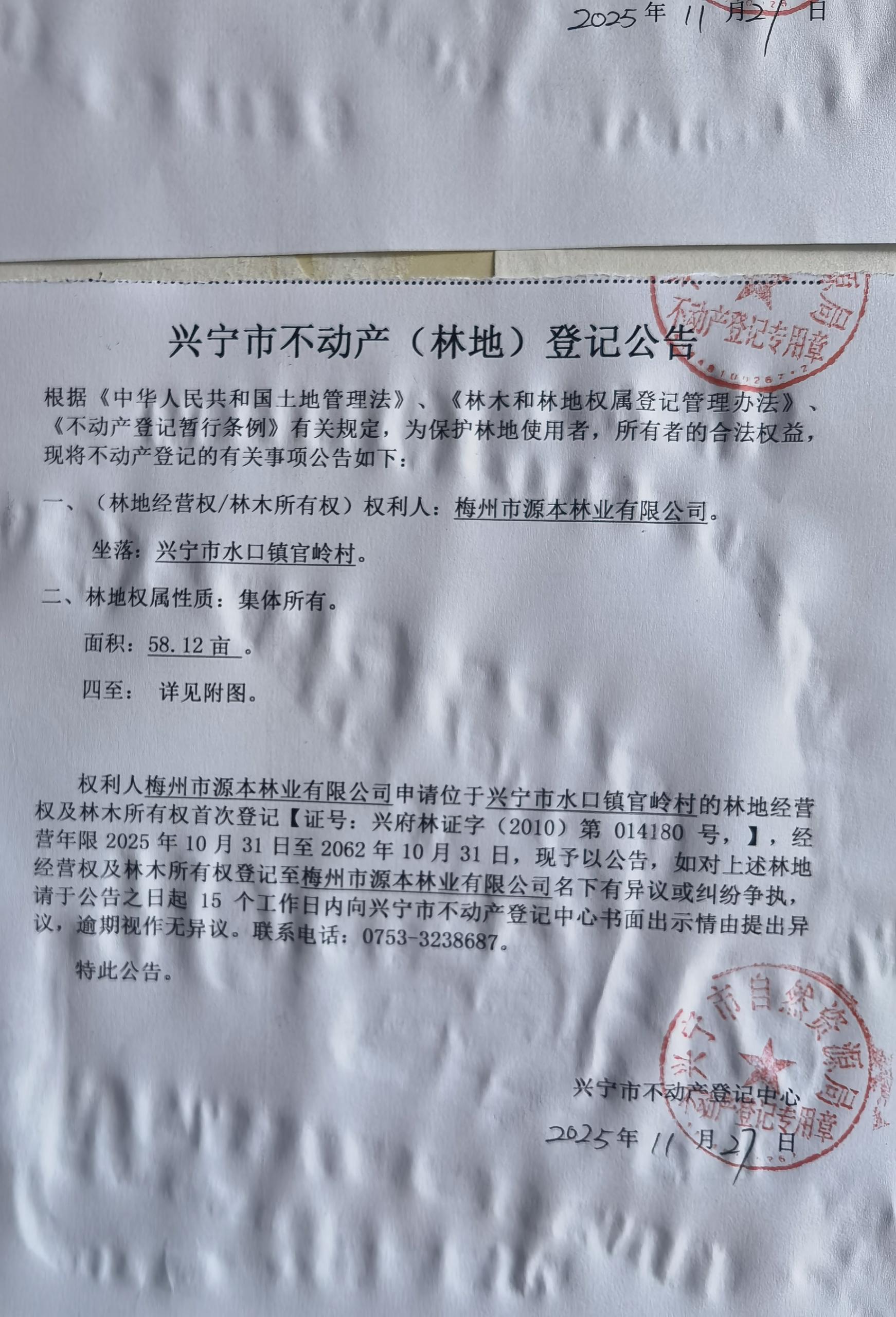兴宁市不动产登记公告(林地经营权首次登记)——官岭村